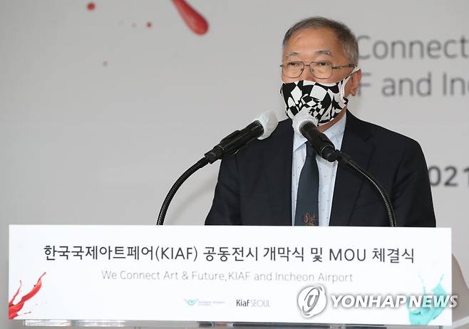 (영종도=연합뉴스) 임헌정 기자 = 황달성 한국화랑협회 회장이 27일 영종도 인천국제공항 제1교통센터에서 열린 '한국국제아트페어(KIAF·키아프) 특별전시' 개막식에서 인사말을 하고 있다. 2021.9.27