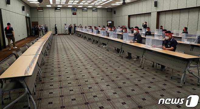 (서울=뉴스1) 황기선 기자 = 전국금융산업노동조합원들이 27일 오후 서울 중구 은행회관 국제회의실에서 열린 '2021년 산별중앙교섭 및 중앙노사위원회 1차 공동교섭'에서 사용자협의회 대표의 참석을 기다리고 있다. 이날 금융노조는 공동교섭에 불참한 사측에게 교섭을 촉구하는 항의서한을 전달했다. 2021.9.27/뉴스1
