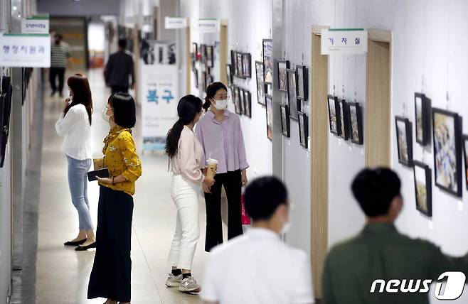 (광주=뉴스1) 허단비 기자 = 광주 북구 공직자들이 27일 광주 북구청 2층 복도에서 열린 2021 북구민의 날 개청 41주년·지방자치 30주년 기념 특별사진전 '디지털 아카이브, 북구'를 관람하고 있다. 이번 특별사진전에는 80년부터 현재까지 북구의 탄생과 변천사, 일상에서 일어나는 일들을 주제로 작품이 전시됐다.(광주북구 제공)2021.9.27/뉴스1