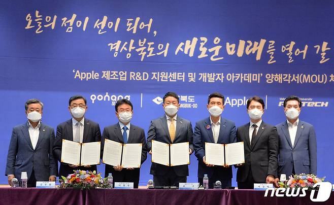(포항=뉴스1) 최창호 기자 = 윤구 애플코리아 사장과 이철우 경북도지사, 이강덕 포항시장 김무환 포스택 총장 등 내빈들이 27일 경북 포항시청에서 열린 애플코리아, 경북도, 포항시, 포스텍 간 에플제조업 R&D지원센터 및 개발자 아카데미 양해각서 체결식에서 양해각서를 교환하고 있다. 지원센터는 국내 제조업에 특화해 운영할 예정이며, SW 핵심 인력들을 양성하는 개발자 아카데미는 국내에서 처음으로 설립하게 된다.한국 내 설립 장소로 포스텍이 선정된 것은 정보통신기술( ICT) 관련 교육 인프라가 잘 갖췄고, 지역의 경제 활성화, 일자리 창출 등을 감안한 결과로 알려졌다. 왼쪽부터 김희수 경북도의회부의장, 김무환 포스텍 총장,이철우 경북도지사, 윤 구 애플코리아 사장, 이강덕 포항시장, 김병욱 국민의힘(포항남울릉)의원, 정해종 포항시의장.2021.9.27/뉴스1