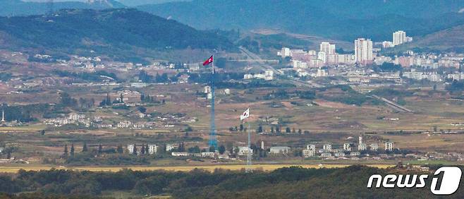 사진은 27일 오전 파주 접경지역에서 바라본 비무장지대(DMZ) 북한 기정동 마을의 인공기와 남한 대성동 마을의 태극기가 나란히 펄럭이는 모습. 2021.9.27/뉴스1