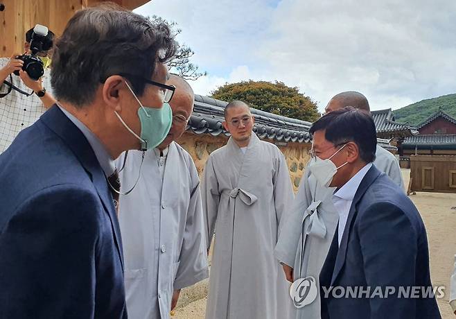 (서울=연합뉴스) 김현모 문화재청장(오른쪽)이 27일 오후 경남 양산 통도사를 방문해 관계자들과 인사하고 있다. 2021.9.27