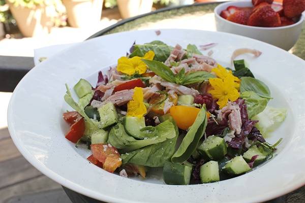 | ▲ 마당에서 딴 오이꽃과 바질, 오이, 토마토를 곁들여 만든 샐러드 |