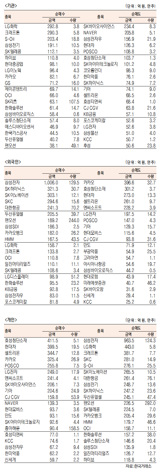 [표]유가증권 기관·외국인·개인 순매수·도 상위종목(9월 27일)