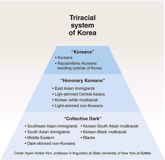 “It is impossible to fit everyone in Korea into the triracial order in the pyramid I presented,” Kim said in an email interview with The Korea Herald.