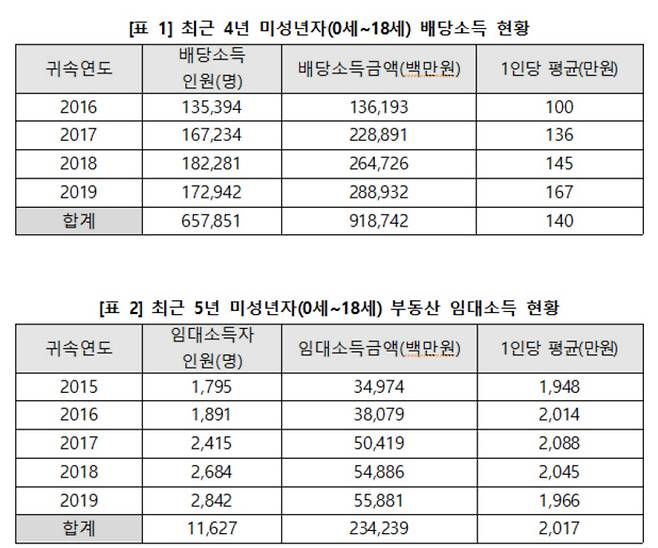 부동산 임대소득의 경우 2019년 귀속 기준 종합소득세를 신고한 미성년 임대소득자는 2842명으로, 연간 기준 역대 가장 많았다. 이들이 벌어들인 임대소득은 총 558억8100만원으로, 1인당 평균 1966만원에 달했다.