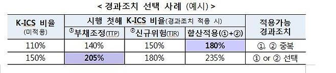 경과조치는 보험회사가 적용사실을 사전 신고하면, 엄격한 제약조건 이행을 전제로 허용할 방침이다. 사전신고는 제도시행 이전 일괄접수한다. 또 경과조치를 적용받은 보험회사들이 적극적으로 자구노력을 할 수 있도록 사후관리도 실시한다.