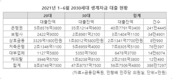 올해 상반기 2030세대의 금융권 생계자금 목적 대출 잔액은 56조원에 달했다.