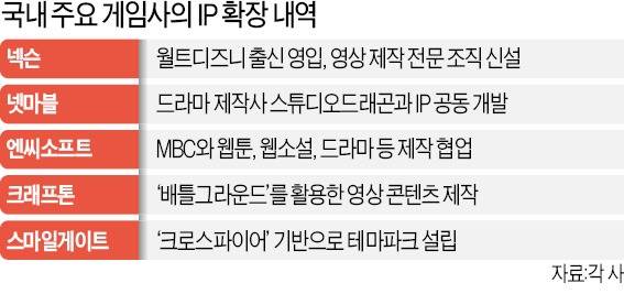 국내 게임업체들이 자사 인기 게임 지식재산권(IP)을 앞세워 엔터테인먼트 사업을 확장하고 있다. 영화, 웹툰, 테마파크 등 분야도 다양하다. 관련 사업을 강화하기 위해 전문가 영입에도 적극 나서고 있다.