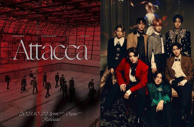 세븐틴도 신보로 10월을 더욱 풍성하게 만들 예정이다. 내달 22일 미니 9집 ‘Attacca’ 발매를 확정한 세븐틴은 오늘(27일) 프로모션 스케줄러를 공개하며 본격적인 컴백 카운트다운에 돌입했다. 지난 6월 미니 8집 ‘Your Choice’ 이후 약 4개월 만의 초고속 컴백에 힘입어 ‘Attacca’는 예약 판매 하루 만에 선주문량 자체 최고 기록인 141만 장을 넘겨 또 한번 밀리언셀러를 예고하고 있다.