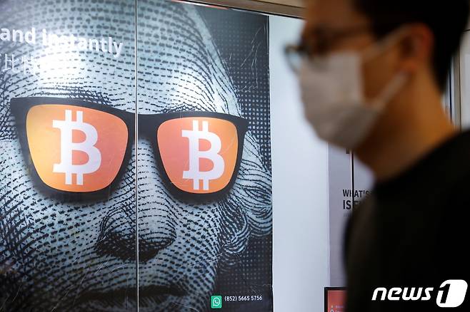 (홍콩 로이터=뉴스1) 금준혁 기자 = 27일(현지시간) 홍콩에 있는 비트코인과 암호화폐(가상화폐) 광고의 모습. 중국은 지난 24일 모든 암호화폐 거래를 불법으로 규정했다.