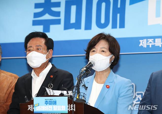 [제주=뉴시스] 우장호 기자 = 더불어민주당 추미애 대선 경선 후보가 27일 오후 제주도의회 1층 도민카페에서 '제주 미래비전 발표' 기자회견을 열어 발언하고 있다. 2021.09.27. woo1223@newsis.com