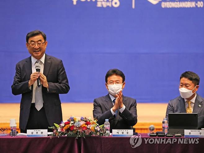 왼쪽부터 김 총장, 이철우 경북도지사, 윤구 애플코리아 대표. 2021.9.27