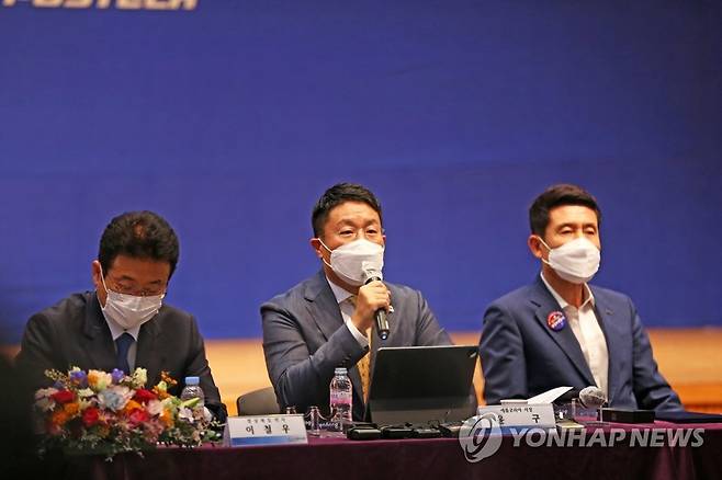 왼쪽부터 이철우 경북도지사, 윤 대표, 이강덕 포항시장. 2021.9.27