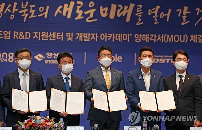 (포항=연합뉴스) 손대성 기자 = 27일 경북 포항시청에서 열린 '애플 제조업 R&D지원센터 및 개발자 아카데미' 설립·운영에 관한 양해각서 체결식에서 주요 참석자들이 서명한 양해각서를 들어 보이고 있다.