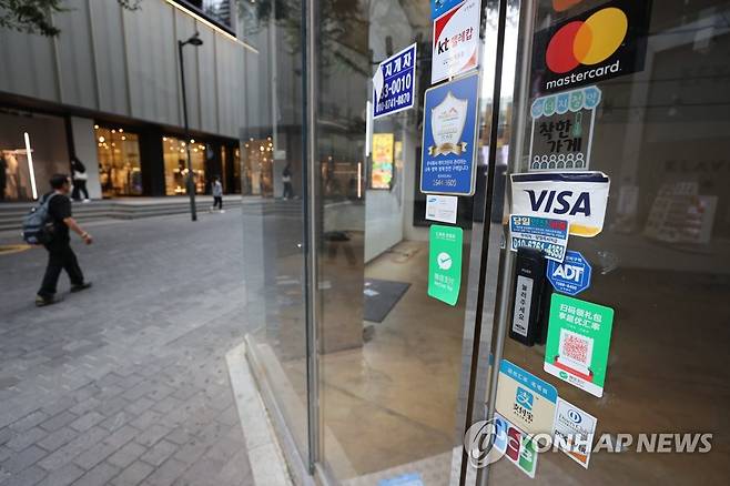 사진은 27일 오후 서울 중구 명동에 폐업한 한 가게에 붙어있는 신용카드 등 안내 표시.