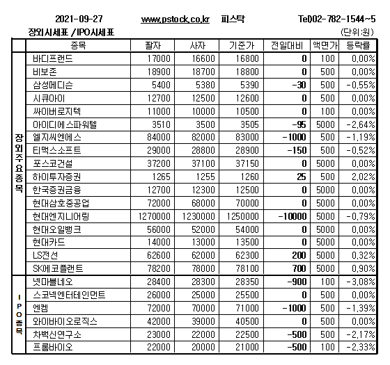 스코넥엔터테인먼트(2만5500원), 와이바이오로직스(4만500원), 싸이버로지텍(1만500원), 현대카드(1만3500원), 에스바이오메딕스(1만1250원), 에이프로젠(2만8000원), 엔쓰리엔(1400원) 등 장외종목은 주가변동없이 장을 마감했다.