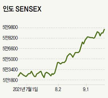 금융투자업계에 따르면 인도 대표 주가 지수인 센섹스(SENSEX)지수는 연초부터 지난 9월 22일까지 약 22% 올랐다. 이 기간 한국의 코스피를 비롯해 중국, 일본, 대만 등 아시아 증시는 대부분 박스권 흐름을 보였다. 특히 부동산개발 기업인 헝다그룹 파산 우려와 규제 리스크로 연일 살얼음판인 홍콩 항셍지수와는 더욱 대조를 이뤘다.