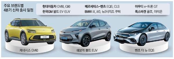 쿠페형 크로스오버유틸리티차량(CUV) 스타일의 제네시스 GV60는 얼굴 인식으로 차량을 제어하는 '페이스 커넥트', 스마트키 없이 지문으로 시동과 주행이 가능한 '지문 인증 시스템' 등 첨단 기술로 무장해 기대감을 키우고 있다. 신형 G90는 하이브리드 모델을 라인업에 추가하고 '레벨3' 수준의 자율주행 기능을 탑재할 것으로 알려졌다. 한국GM은 신형 볼트 EV와 브랜드 첫 전기 SUV인 볼트 EUV의 4분기 출시를 조율하고 있다. 배터리 화재 위험성 문제로 GM 본사에서 볼트 EV 전 모델에 대해 리콜을 결정하면서 정확한 출시 일정은 불투명하다. 그러나 최근 GM 본사가 미국 배터리팩 공장을 재가동하면서 연내 신차 출시에 '청신호'가 켜졌다.