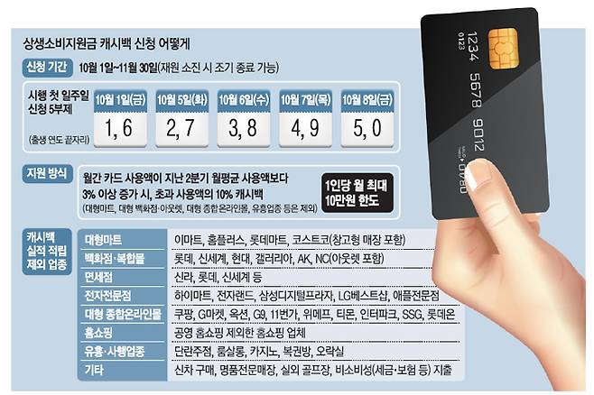 정부는 신청 시기에 관계없이 신청만 하면 10월 1일 소비분부터 계산해 2개월간의 환급금을 지급한다는 방침이다. 다만, 7000억원으로 제한된 재원이 조기 소진되면 캐시백을 받지 못할 가능성도 있기 때문에 10~11월 지출 증가가 예상되는 사람이라면 가급적 빨리 신청하는 것이 좋다.