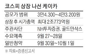 케이카는 27~28일 기관투자자 수요예측을 통해 공모가를 확정 짓는다. 희망 공모 가격은 3만4300~4만3200원 사이다. 일반공모 청약은 오는 30일부터 10월 1일까지 진행된다. 공모가 상단 기준 공모금액은 7271억원, 상장 직후 시가총액은 2조773억원이다. 상장 당일 유통 가능한 물량은 전체 주식 수 대비 약 28%(1346만주)다. NH투자증권과 골드만삭스가 대표 주관사로 참여했다.