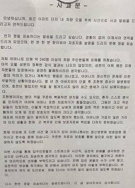 오늘(27일) 한 온라인 커뮤니티에는 지난 7월 벌어진 '오물 테러' 사건과 관련해 피의자의 아들이 작성한 사과문의 사진이 게시됐습니다.