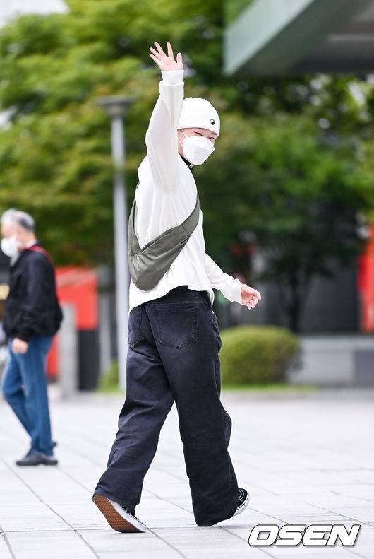 가수 우즈가 사옥으로 들어서며 취재진을 향해 포즈를 취하고 있다. 2021.09.27 / soul1014@osen.co.kr