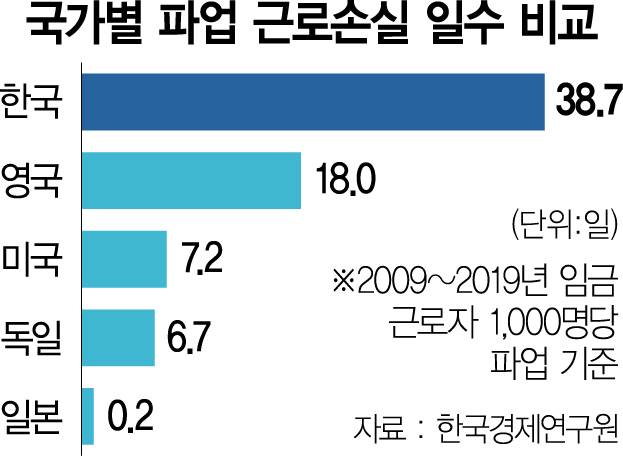 국내 노동법은 노동자에게 기울어진 운동장을 만들었다는 평가를 받는다. 산별노조가 허용되고 해고를 원천적으로 막았다. 해외와 달리 파업 시 대체근로 투입, 직장 점거 해산도 제한한다. 그 결과 양대 노총인 민주노총과 한국노총의 총 조합원 수는 200만 명을 훌쩍 넘어섰다. 자동차·철강·운수 등 곳곳에서 발생하는 파업은 불법의 경계까지 넘나든다. 노사정 기구인 경제사회노동위원회에 불참 중인 민주노총은 오는 10월 110만 명이 모이는 정치 파업 성격의 총파업을 예고했다.
