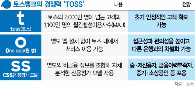 토스는 케이뱅크·카카오뱅크에 이어 4년여 만에 출범하는 세 번째 인터넷은행이다. 초기에 선보일 상품이나 서비스는 동종 업계와 큰 차이가 없지만 △토스(Toss) △원 앱(One app) △신용평가모델(cSS)의 경쟁력을 통해 확실한 차별화에 나설 계획이다.