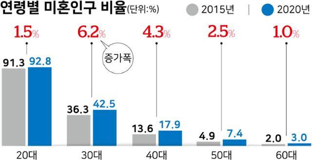 연령 집단별 미혼 인구 비중은 모든 연령대에서 증가했다. 이 중 30대의 증가폭이 6.2%포인트로 가장 컸다. 40대와 50대의 증가폭도 각각 4.3%포인트와 2.5%포인트로 뒤를 이었다.