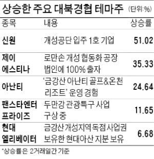 개성공단에 입주한 이력이 있는 기업들도 이날 일제히 급등했다. 로만손 개성 협동화 공장 법인에 100% 출자한 제이에스티나가 29.97% 올랐다. 개성공단 입주 1호 기업인 신원은 이날 16.23% 올랐다.