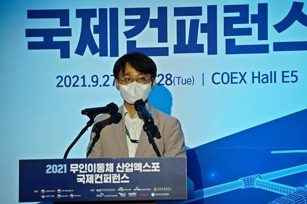 국토교통부 미래드론교통관 나진항 과장이 27일 서울 코엑스에서 열린 '2021 무인이동체산업엑스포(UWC) 국제컨퍼런스'에서 '한국형 도심항공교통(K-UAM) 정책 일반 및 기술동향'에 대해 강연했다.