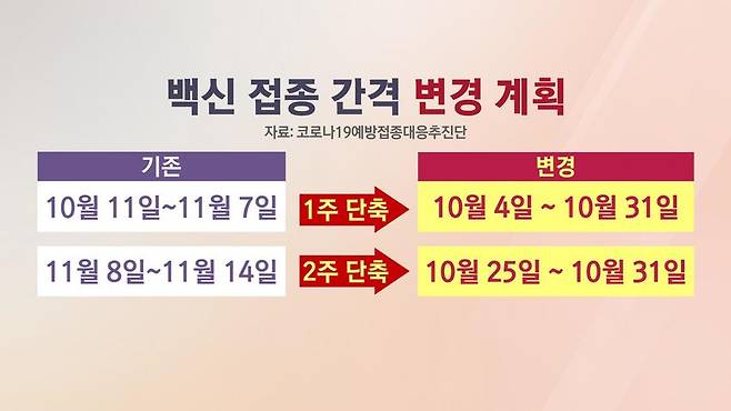 2차 접종 예약일이 10월 11일~11월 7일인 경우 접종 간격이 일주일 단축되고, 11월 8일~11월 14일로 예정된 경우 2주가 단축됩니다.