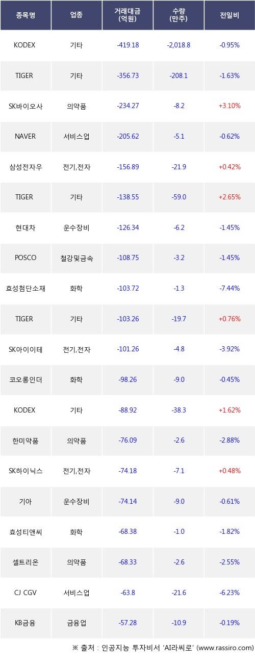 기관 투자자의 순매도 상위 20개 종목은 KODEX 200선물인버스2X, TIGER 차이나전기차SOLACTIVE, SK바이오사이언스, NAVER, 삼성전자우, TIGER 2차전지테마, 현대차, POSCO, 효성첨단소재, TIGER 미국S&P500선물(H)등이다.