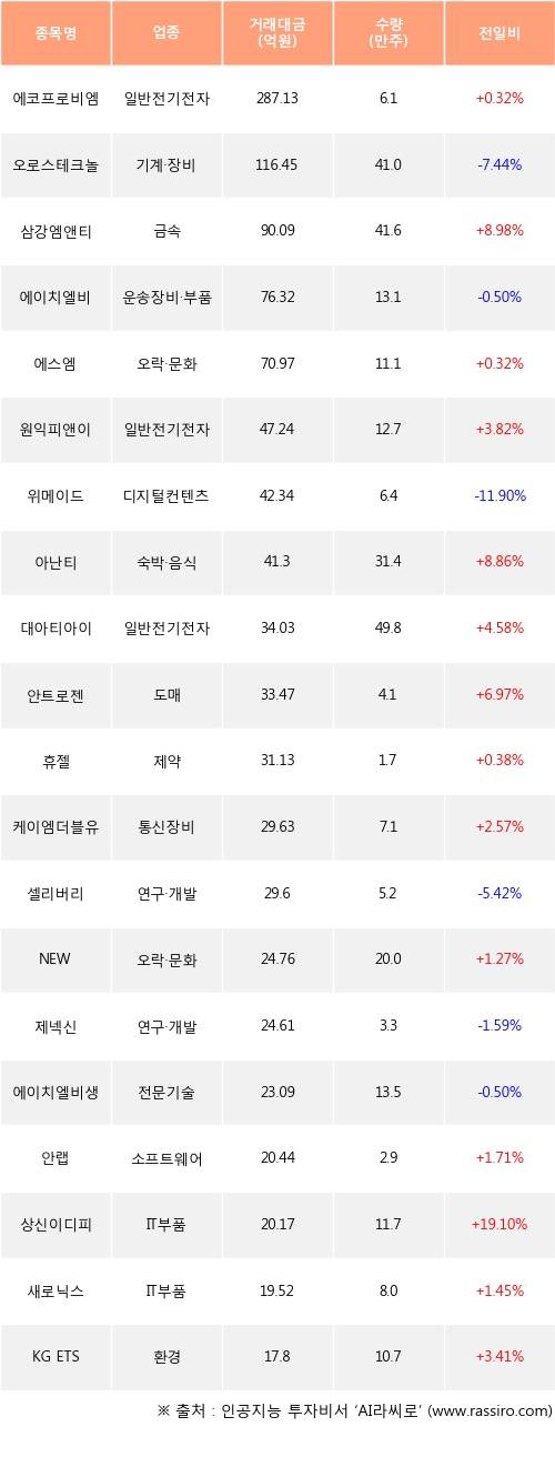 에코프로비엠, 삼강엠앤티, 에스엠 등은 전일 대비 주가가 상승했고, 오로스테크놀로지, 에이치엘비, 위메이드 등은 주가가 하락했다.