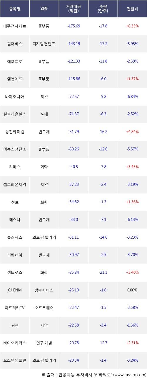 외국인 투자자의 순매도 상위 20개 종목은 대주전자재료, 펄어비스, 에코프로, 엘앤에프, 바이오니아, 셀트리온헬스케어, 동진쎄미켐, 이녹스첨단소재, 라파스, 셀트리온제약등이다.