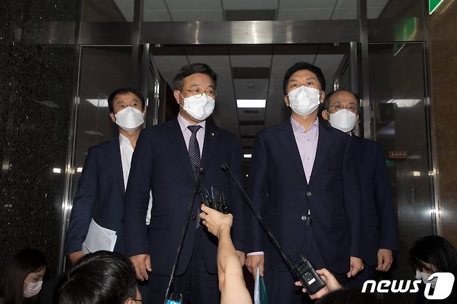(서울=뉴스1) 구윤성 기자 = 윤호중 더불어민주당 원내대표와 김기현 국민의힘 원내대표가 27일 저녁 서울 여의도 국회에서 박병석 국회의장 주재로 열린 여야원내대표회동을 마치고 취재진의 질문에 답하고 있다. 여야는 언론중재법 처리를 위해 이날 열기로 했던 본회의를 28일로 연기하고, 다시 한번 원내대표회동을 통해 논의를 이어가기로 했다고 밝혔다. 2021.9.27/뉴스1