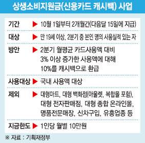 A. 신용·체크카드를 2분기 월평균 사용액보다 3% 이상 쓰면 해당 증가분의 10%를 1인당 월 10만 원까지 현금성 충전금으로 돌려주는 사업이다. 예를 들어 2분기 월평균 카드 사용액이 100만 원이고 10월 카드 사용액이 163만 원인 경우 증가액 63만 원 가운데 3만 원을 공제한 60만 원의 10%인 6만 원이 지급된다.