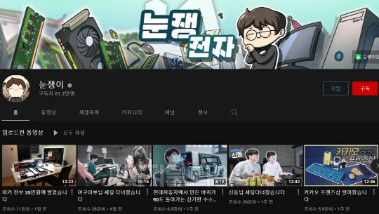 1위를 차지한 채널 '눈쟁이'는 구독자 수 61만 명, 누적 조회 수 2억 4500만 회를 보유하고 있다. 인기 게임 유튜버로 활약하던 눈쟁이(본명 박희준)는 2019년경부터 컴퓨터와 각종 IT 기기 관련 콘텐츠를 주력으로 선보이며 테크 유튜버의 길에 발을 들였다. 테크 유튜버로 전향 후에도 꾸준한 인기를 얻으며 2019년 12월 구독자 50만 명을 돌파하고, 올해 2월 60만 명 고지도 넘어섰다.