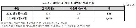 27일 과학기술정보방송통신위원회 김상희 국회부의장이 방송통신심의위원회에서 제출받은 자료에 따르면 '딥페이크 성적 허위영상' 차단·삭제 건수는 작년 6월 25일 이후 12월까지 548건에서 올해 1월부터 9월 24일까지 1408건으로 2.5배 이상 증가했다. 월평균 건수도 약 91건에서 156건으로 1.7배 늘었다. 딥페이크 성적 허위영상물의 제작·배포를 금지하는 성폭력범죄처벌법이 작년 6월 25일부터 시행됐지만 범죄 건수는 더 늘어난 상황이다.