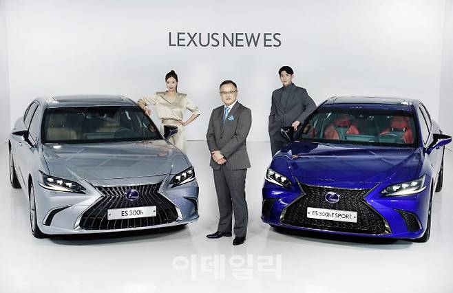 타케무라 노부유키 렉서스코리아 사장(가운데)이 27일 렉서스 전동화 모델을 대표하는 프리미엄 하이브리드 세단 'New ES'의 온라인 출시 행사에서 포즈를 취하고 있다.