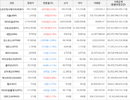 또한, 세럼(4.19%, 9,700원), 비트코인캐시에이비씨(3.51%, 290,100원), 엑시인피니티(0.98%, 78,670원), 리플(0.87%, 1,165원), 이더리움(0.13%, 3,744,000원)이 상승세를 나타냈다.