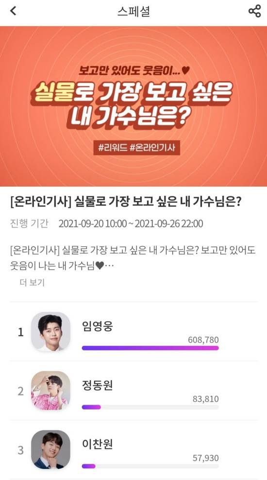 이 투표에서 임영웅은 608,780표를 받으며 1위를 차지했다.