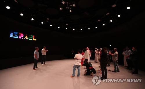 epa09491348 Malki Shem-Tov (L), the CEO of the Israeli Pavilion, and Menachem Gantz (2-L), the Spokesman and Communication Manager for the Israeli pavilion, talk during a media tour at the Israeli pavilion of the EXPO 2020 Dubai some days prior to the official opening in the Gulf emirate of Dubai, United Arab Emirates, 27 September 2021. The EXPO 2020 Dubai is supposed to open its doors to the visitors on 01 October 2021 after it has been postponed due to the COVID-19 pandemic from October 2020. EPA/ALI HAIDER
