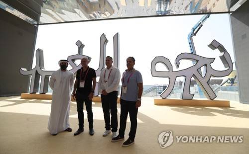 epa09491350 (L-R) An unidentified Emirati official, Josh Bendit, the Israeli Pavilion Director, Menachem Gantz, the Spokesman and Communication Manager for the Israeli pavilion and Malki Shem-Tov, the CEO of Israeli Pavilion, pose in front of a words statue in Arabic and Jewish languages reading 'Towards for Tomorrow' during a media tour at the Israeli pavilion of the EXPO 2020 Dubai some days prior to the official opening in the Gulf emirate of Dubai, United Arab Emirates, 27 September 2021. The EXPO 2020 Dubai is supposed to open its doors to the visitors on 01 October 2021 after it has been postponed due to the COVID-19 pandemic from October 2020. EPA/ALI HAIDER