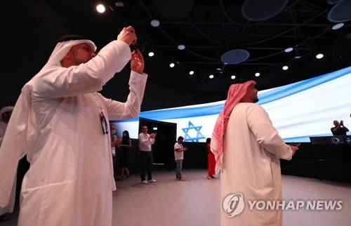 epa09491390 People walk the building during a media tour at the Israeli pavilion of the EXPO 2020 Dubai some days prior to the official opening in the Gulf emirate of Dubai, United Arab Emirates, 27 September 2021. The EXPO 2020 Dubai is supposed to open its doors to the visitors on 01 October 2021 after it has been postponed due to the COVID-19 pandemic from October 2020. EPA/ALI HAIDER