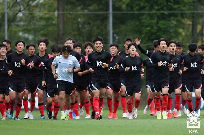 [서울=뉴시스] U-23 축구 대표팀 선수들이 27일 경기 파주시에 위치한 국가대표트레이닝센터(NFC)에서 훈련을 하고 있다. (사진=대한축구협회 제공) 2021.09.27. photo@newsis.com *재판매 및 DB 금지