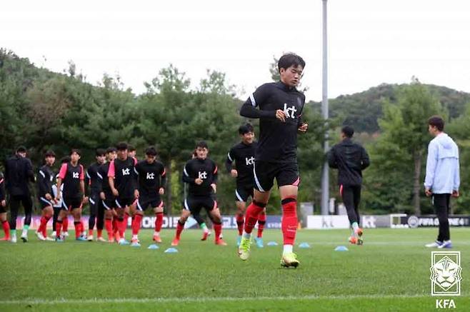 [서울=뉴시스] U-23 축구 대표팀 선수들이 27일 경기 파주시에 위치한 국가대표트레이닝센터(NFC)에서 훈련을 하고 있다. (사진=대한축구협회 제공) 2021.09.27. photo@newsis.com *재판매 및 DB 금지