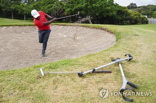epaselect epa09491597 Single leg amputee Simo Mdudu of South Africa hits out a bunker during the Cape Town Disabled Golf Open on the King David Mowbray Golf course in Cape Town, South Africa, 27 September 2021. Postponed for two years due to covid-19 the Cape Town Disabled Golf Open is one of the top disabled golf tournaments in the world. People suffering from any kind of physical disabilities including arm and leg amputees, hemiplegics, paraplegics, stroke victims, blind, and deaf people that are able to grip the club with at least one hand and hit the ball can compete. EPA/NIC BOTHMA