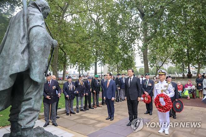 (서울=연합뉴스) 황기철 국가보훈처장이 27일(현지시간) 영국 런던의 한국전 참전비를 방문해 헌화 및 참배하고 있다. 2021.9.27 [국가보훈처 제공. 재판매 및 DB 금지]
